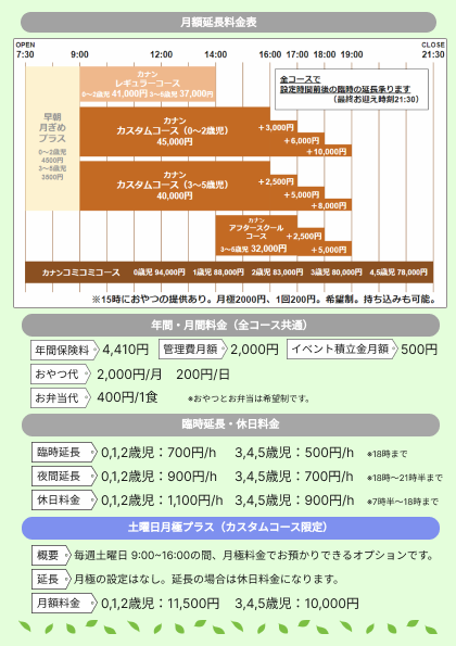 - 夕方~19:00まで月極で延長可能。臨時の延長は7:30~21:30まで可能。